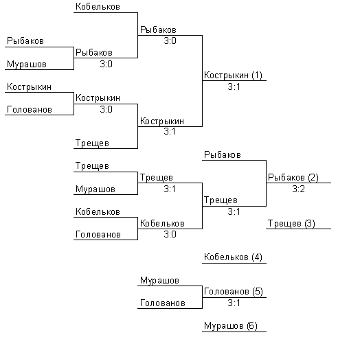 | 2. Кострыкин () | 3:1 | 3:1 | 3:2 | 3 | 9:4 | 1 | ||