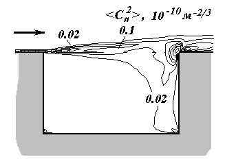 The calculated index of turbulent pulsations near open cavity [Расчетное распределение структурной функции турбулентных пульсаций показателя преломления около открытой выемки] |