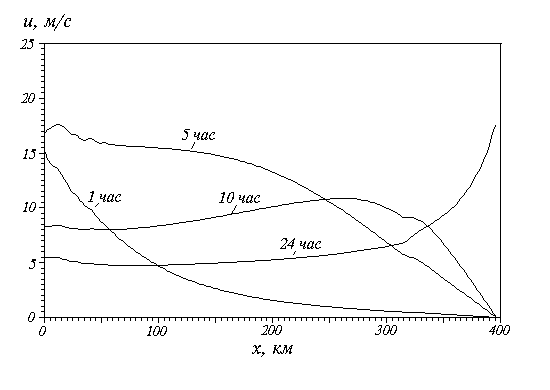 Заполнение природным газом морского участка трубопровода "Россия-Турция". Распределение скорости газа в трубопроводе в различные моменты времени при экспоненциальном законе подъема давления на входе в трубопровод. |