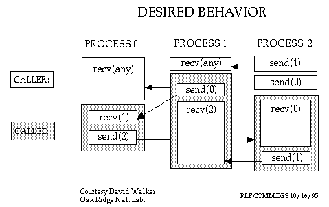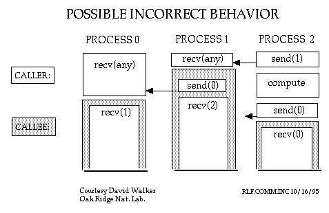 В этом случае коммуникации не происходят как намечено. Первый "receive" в процессе 0 теперь получает "send" из библиотечной функции в процессе 1, а не намеченный (и теперь задержанный) "send" из процесса 2. В результате все три процесса подвисают.