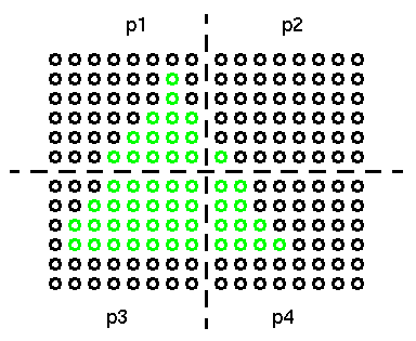Для точек внутри каждого процессорного блока вся необходимая информация для уточнения точки содержится в этом процессе. Чтобы уточнить процессорные граничные точки необходимы строки и колонки точек, содержащихся у соседей.