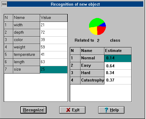 Input values of features for recognition of new object (for example, <21,72,39,59,41,68,25>) and press Recognize.