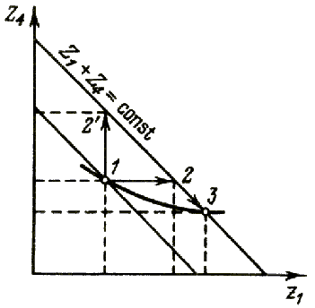 It is obviously to generalize the Le Chatellier principle for whole the system as fulfillment of a condition (2) for all variables l = 1, :, n. It is easy to prove that the conditions are equivalent to fulfillment of a condition (2) for all variables l = 1, :, n and hence are the expression of the Le Chatellier principle for whole the system. Such treatment of the Le Chatellier principle allows us to calculate its fulfillment in the systems with plenty of variables for which the analytical calculation of corresponding derivatives is practically impossible with the aid of the simple computer calculations. It is necessary to change instantly value of any one variable of the system and then to calculate whether positive or negative are changes of every variable in a new stationary state. According to (3) the fulfillment of the Le Chatellier principle for whole the system we can interpret as follows: if there is a change of quantity of substance in the system it should be accompanied by change of stationary values of all variables in the same direction. It is possible to prove that the condition (3) for whole the system is equivalent to the following conditions: It means that projections of a line of equilibrum states on a plane (xi ,xj) (i, j = 1..., n; i > j) should be growing functions of one of the phase variables. Given condition in case of two variables n = 2 can be written as: It means that the line of equilibrium states in a plane of variables (x1, x2) should be growing function of x1. In the given treatment the Le Chatellier principle is stronger requirement than Lyapunov's satbility. Possibly system is stable according to Lyapunov's stability but the Le Chatellier principle is not fulfilled. Let us consider an example. The biosphere is represented by system atmosphere - grasslands - soil in which the quantity of carbon is constant in absence of CO2 releases. We have two variables: Z1 - quantity of carbon in the atmosphere and Z4 - quantity of carbon in soil humus. Weight of grassland vegetation can be neglected. We consider that the system in absence of influences is in a steady state. Let us consider a plane of variables (Z1 , Z4) (fig. 1). The condition of a constancy of quantity of carbon in the system means that the trajectories of the system should be on lines of constancy Z1 + Z4 = M = const. If we increase instantly the quantity of atmospheric CO2 (fig. 1 à) the point representing a condition of system will be moved on a new state (from a point 1 to 2) corresponding a new line of constancy. Then it will move to a new steady state over line of constancy (point 3). So the contents CO2 in the atmosphere was instantly increased in result of external action and then decreased a little in result of internal ability. Result of action was weakened. Similarly system answers to change of quantity of humus. We must point out that the effect of influence is compensated not completely.