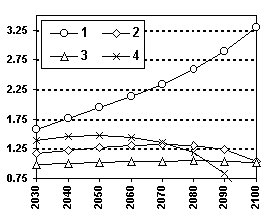 The Le Chatellier principle is fulfilled if the line of equilibrium state increases with the growth of Z1 (see condition (5) and fig. 1a). If the line decreases (fig. 1 b) the system answers to instant CO2 increase in the atmosphere so that the effect of influence either amplifies (when the quantity of carbon in the atmosphere increases) or becomes smaller that the initial state (when the quantity of humus increases). In this case the Le Chatellier principle is not fulfilled. Thus, at in result of CO2 emissions to the atmosphere in the system atmosphere - grasslands - soil the Le Chatellier principle can be fulfilled or not fulfilled. In the models describing the global biogeochemical carbon cycle under the nonlinear character of dependence of annual production on atmospheric CO2 concentration and on temperature at the small and moderate influences the principle is fulfilled and at the strong influences - is not fulfilled. In the latter case effect of influence amplifies. Calculations show that the present time the Le Chatellier principle concerning CO2 releases to the atmosphere will be fulfilled at least until the beginning of XXII century (fig. 1 a). But if we suppose that annual terrestrial plant production is decreased at CO2 concentration is more than nowadays by 1.5 times (such dependence was measures in some laboratories) Le Chatellier principle fulfillment would be ceased during 2050-2100 (fig 2.b). In this case land ecosystems becomes a source of CO2 . It should be noted that the last simulating example is presented to demonstrate idea of the Le Chatellier principle only and most possible can not be considered as a forecast of future of the biosphere.